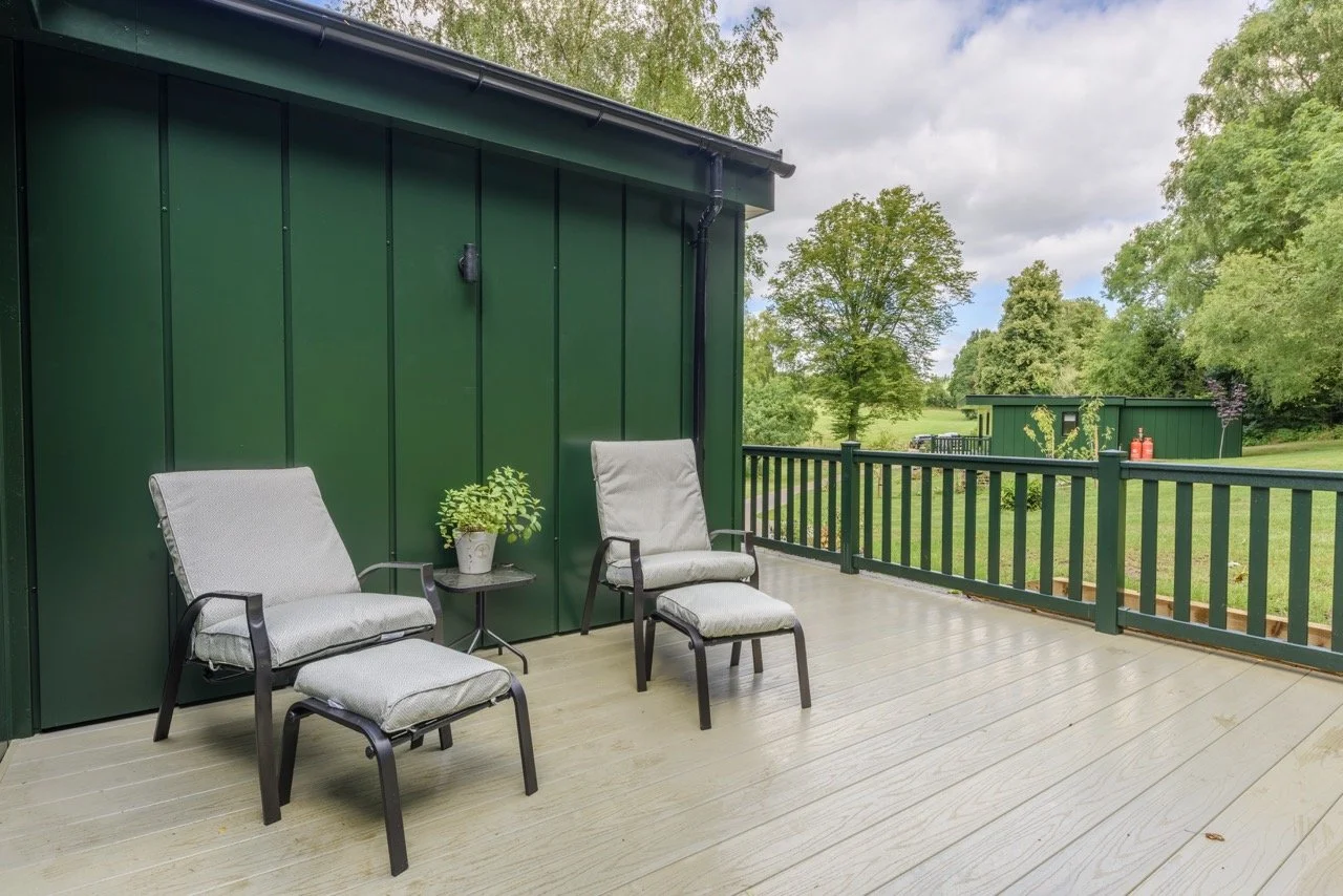 Green building labeled 'The Larches' near a deck overlooking a pond and trees.